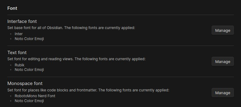 Когда вы их установите, хранилище само подтянет их как основные, так как это указано в general-view.css. Но всё же вы можете указать их дополнительно в настройках самого Obsidian.