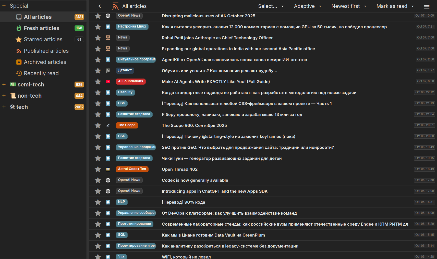 Для себя я прихожу к выводу, что RSS-ридер должен оставаться отдельным инструментом. Его задача — быть первым фильтром, буфером между бесконечным потоком информации и базой знаний.