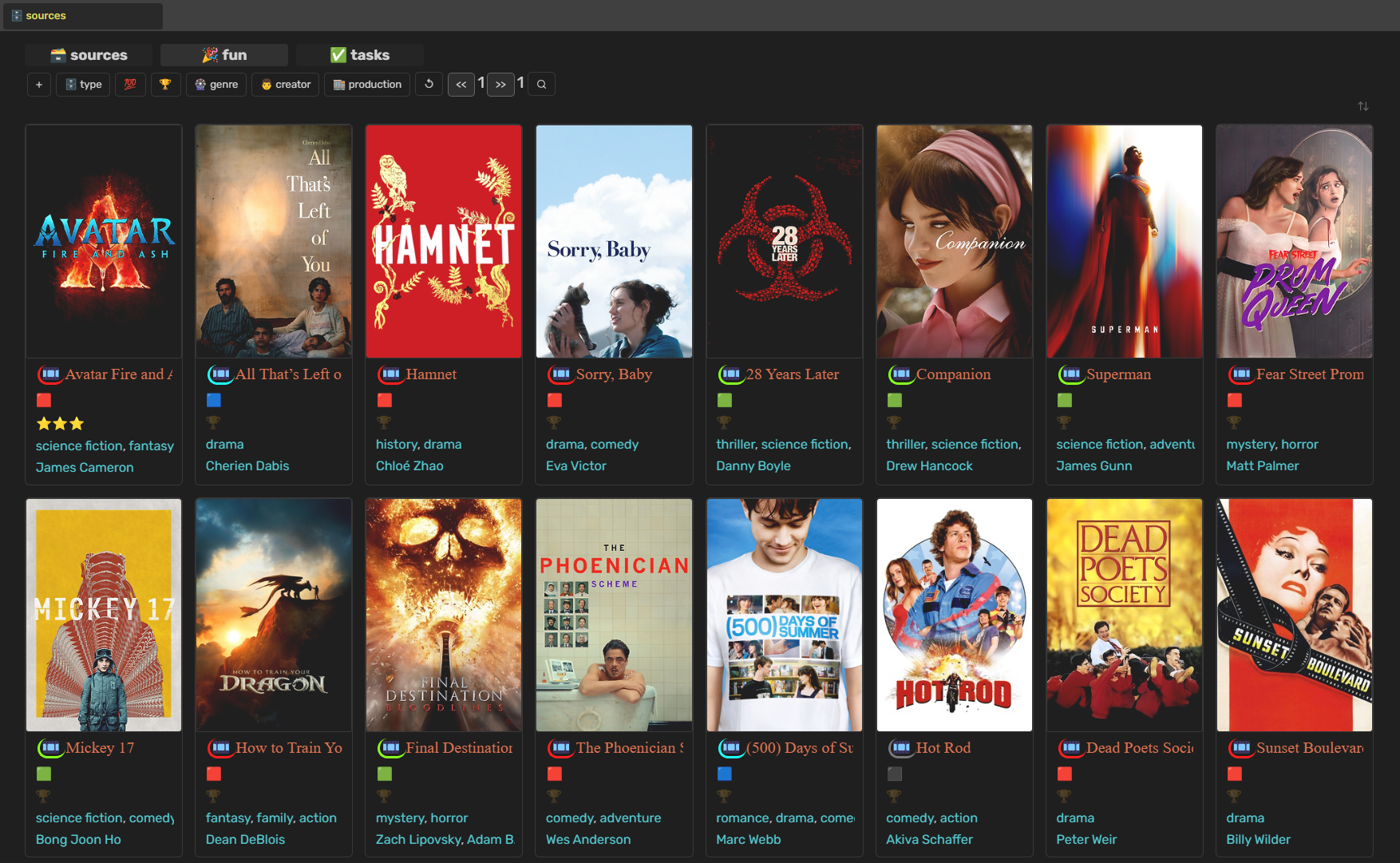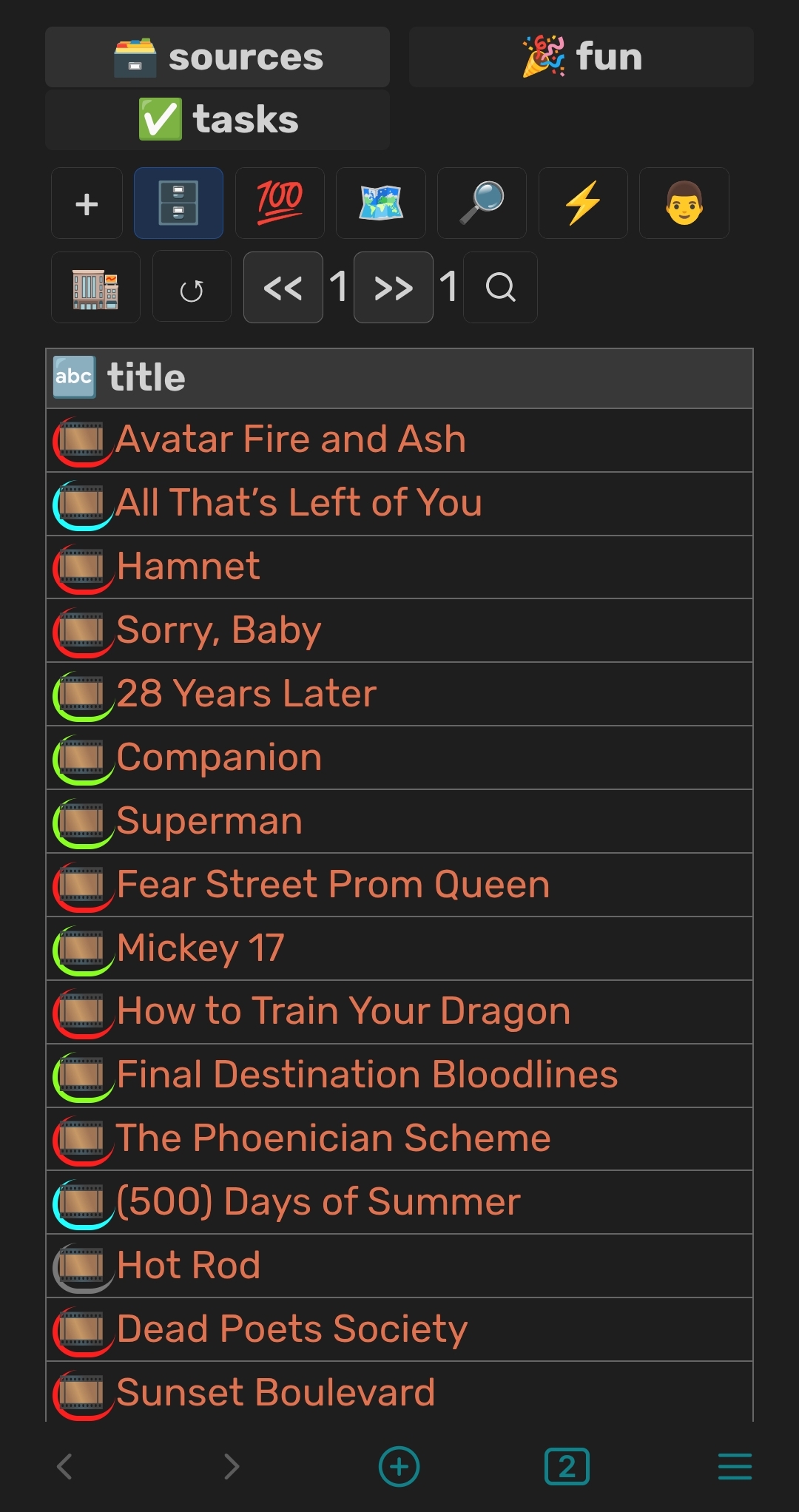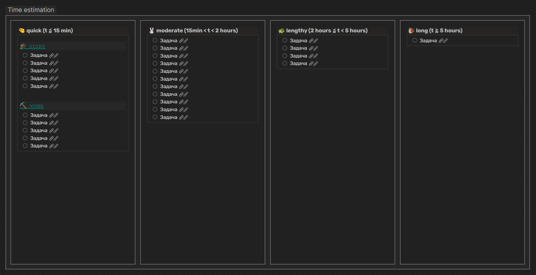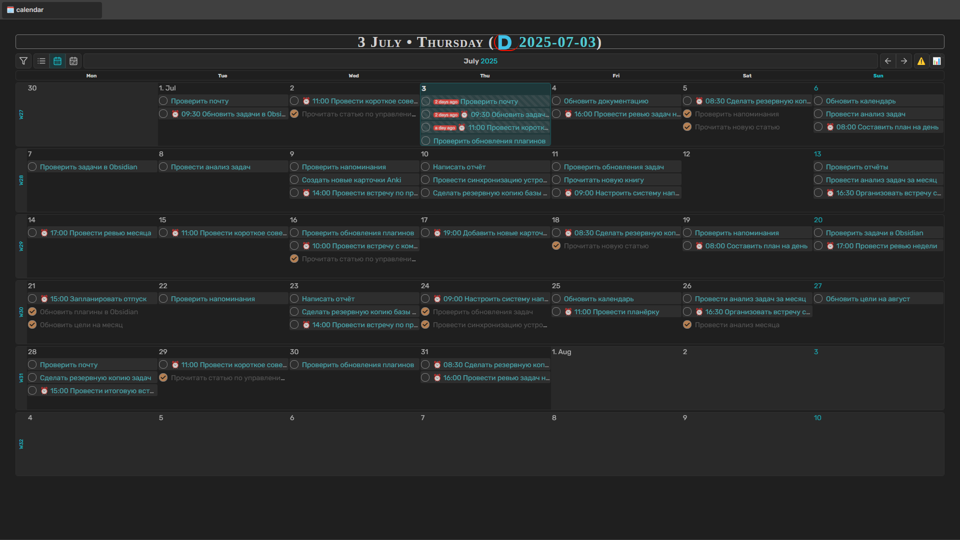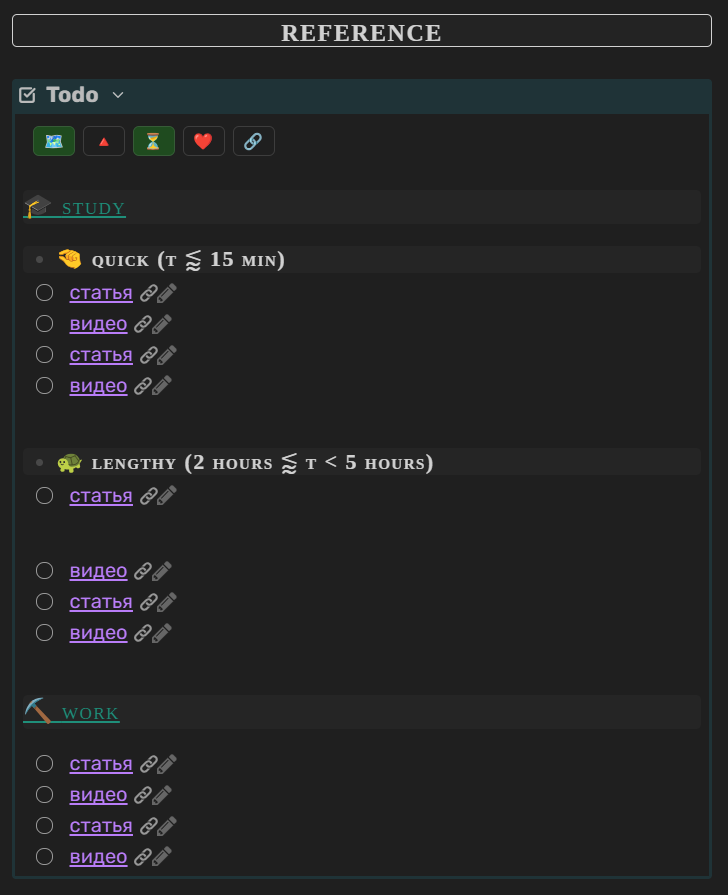 - Установлен плагин Meta Bind для быстрых фильтрующих кнопок