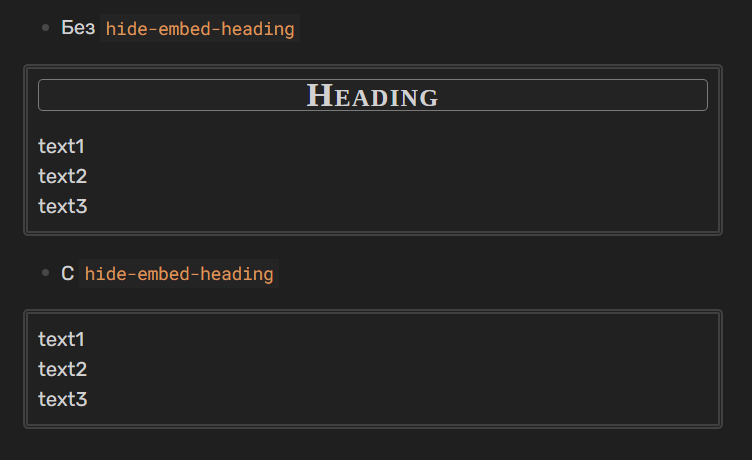 - hide-embedded-heading – скрывает заголовки у встроенных заметок