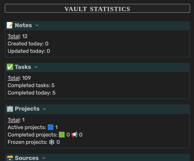 - Добавлена заметка с базовой статистикой vault statistics.md. Зайти в неё можно через